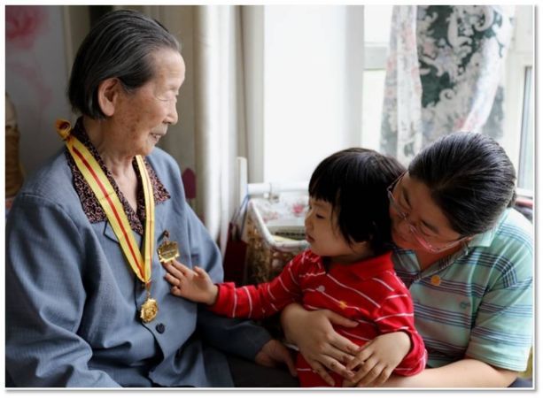 姨奶自己沒有孩子,但是非常疼愛我的女兒,每次孩子在上學(xué)前都要彼此招手再見才讓出門,女兒是她的好朋友。記得,2015年抗日戰(zhàn)爭勝利七十周年前夕,中央給每位老戰(zhàn)士送來抗戰(zhàn)勝利紀念章和5千塊錢慰問金,姨奶非常珍視,拿出其中的3千元交給妻子,囑咐說:“這是中央給我的錢,一定要作為孩子入學(xué)第一年的學(xué)費”。比較欣慰的是,孩子從小乖巧,雖然還會和老奶奶爭著看動畫片、搶遙控器,但是即使再喜歡的東西,都會主動與老奶奶分享。一次我們回老家,回來時已經(jīng)挺晚了,老人已經(jīng)進了自己的房間,那年孩子應(yīng)該是不到四歲,大人們都在忙活著歸置整理東西,小朋友自己打開盒子拿了一串葡萄送到了老奶奶的房間,老奶奶從房間里出來的那一刻,我看到了她激動的眼含淚光。
